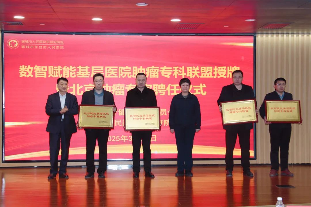 会议期间,聊城市数智赋能基层医院肿瘤专科联盟正式成立。侯森副会长与王红副主任医师共同为东昌府区中医院、莘县中医院、阳谷县中医医院、冠县新华医院等联盟单位授牌。王吉民局长为肿瘤领域的王济东、丁晓燕、陈星宇三位专家颁发了特聘专家聘书,进一步充实了聊城肿瘤医疗的专家力量。